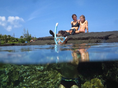 Après 12km on trouve un camping. Il n'y a pas de plage alors on va faire du masque et tuba.