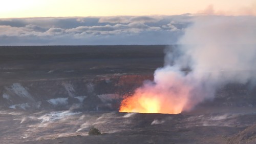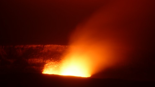 (De nuit on voit le reflet du volcan dans la fumée et c'est tout rouge.)