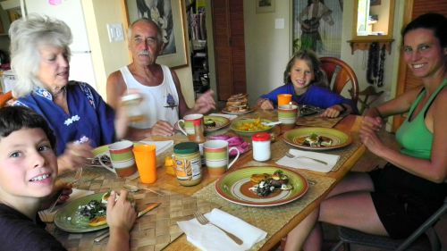 nous concocte de superbes repas tout droit tirés de la jungle locale. Fougères, feuilles de tarots, racines, watercrest, poissons sans conter tous les fruits que nous ne