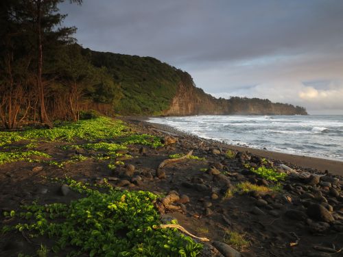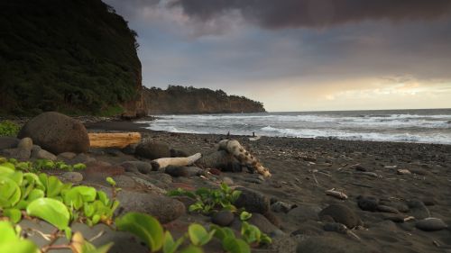 Plage de sable noir, feuillages rampants vert tendre, palmiers, hala (pandanus) et autre arbres étonnants arborant des