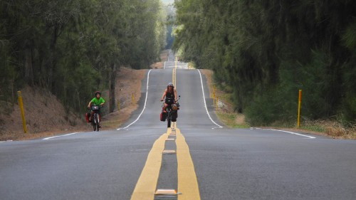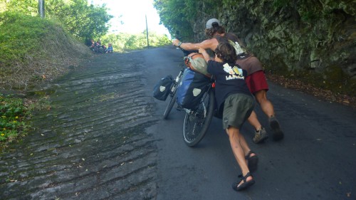 cause, une pente de 25% sur 2km ! Tellement raide que parfois on descend à pied, car les freins des vélos lourdement chargés de nourriture ne