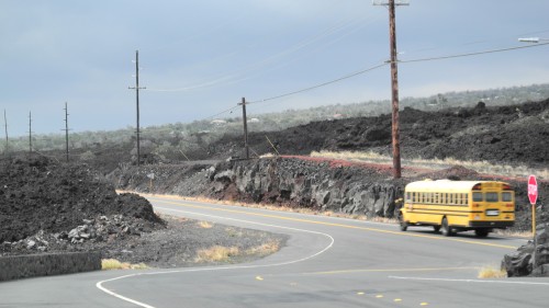 d'asphalte au milieu de champs de lave bien noir sous un soleil de plomb et avec une humidité accablante