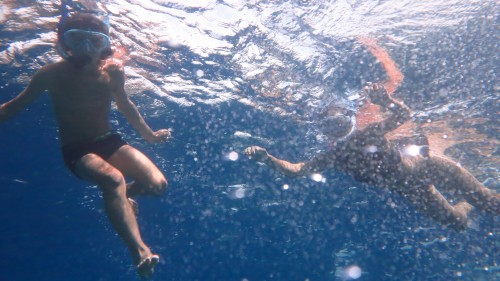 Miriam, les loulous et Sil partent du Zodiac en snorkel alors que je descends avec Alain, chercher les raies.